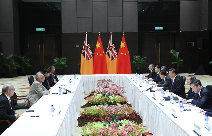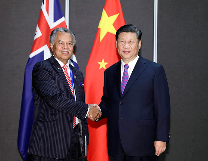 11月16日,國家主席習近平在莫爾茲比港分別會見建交太平洋島國領導人。這是習近平會見紐埃總理塔拉吉。新華社記者 丁林 攝