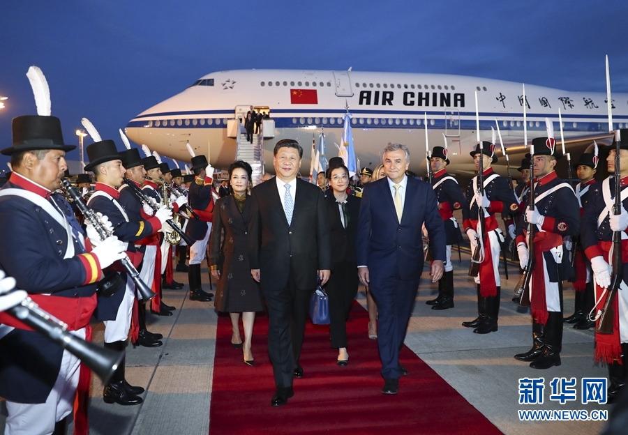 當地時間20時05分許,習近平乘坐的專機抵達布宜諾斯艾利斯埃塞伊薩國際機場。習近平和夫人彭麗媛受到阿根廷外交部長福列、胡胡伊省省長莫拉萊斯等熱情迎接。儀仗隊長趨前致敬,軍樂團奏響雄勁有力的進行曲,習近平和彭麗媛沿紅地毯前行,禮兵分列紅地毯兩側,行注目禮。