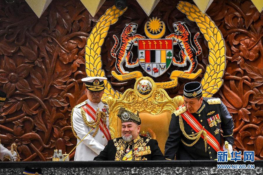 這是2018年7月17日,在馬來西亞吉隆坡,穆罕默德五世(中)出席國會會議的資料照片。 新華社發(張紋綜攝)