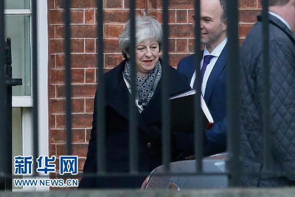 1月14日,在英國倫敦,英國首相特雷莎·梅(左)離開唐寧街10號準備前往議會下院。 新華社發(蒂姆·愛爾蘭攝)