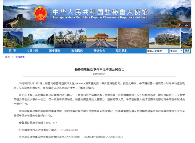 中國駐秘魯使館將繼續跟蹤事件發展,同時提醒在秘中國公民提高安全防范意識,如遇緊急情況請及時報警并聯系中國駐秘魯使館或外交部全球領事保護與服務應急呼叫中心。