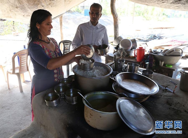 3月26日,在尼泊爾蘇爾凱德,阿查亞(右)與占茜準備食物。新華社發(蘇尼爾·夏爾馬 攝)
