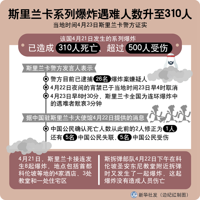 新華社科倫坡4月23日電(記者朱瑞卿 唐璐)斯里蘭卡警方23日證實(shí),該國(guó)21日發(fā)生的系列爆炸已造成310人死亡、超過500人受傷。