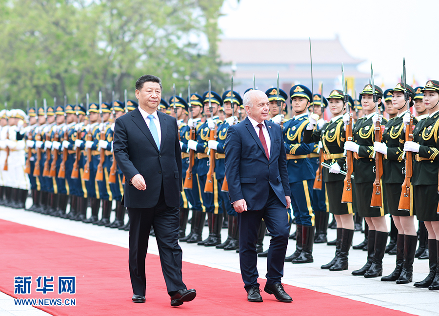 4月29日,國家主席習近平在北京人民大會堂同瑞士聯邦主席毛雷爾舉行會談。這是會談前,習近平在人民大會堂東門外廣場為毛雷爾舉行歡迎儀式。 新華社記者 謝環馳 攝