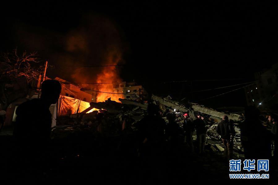 5月4日,巴勒斯坦人在加沙城查看以軍空襲后的建筑廢墟。新華社發