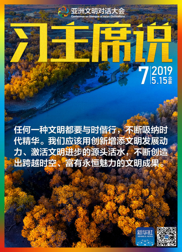 任何一種文明都要與時偕行,不斷吸納時代精華。我們應該用創新增添文明發展動力、激活文明進步的源頭活水,不斷創造出跨越時空、富有永恒魅力的文明成果。