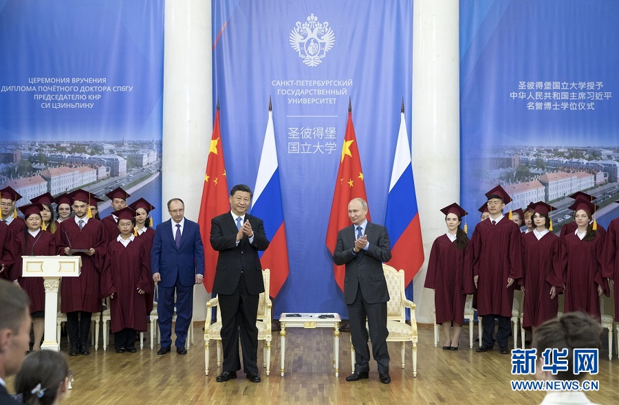 6月6日,國家主席習近平在圣彼得堡出席接受圣彼得堡國立大學名譽博士學位儀式。俄羅斯總統普京出席儀式。新華社記者 李濤 攝