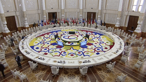 15日上午,杜尚別納烏魯茲宮,習主席出席亞洲相互協作與信任措施會議第五次峰會。圓桌會議開始后,亞信主席國元首拉赫蒙總統邀請習主席第一個發言。