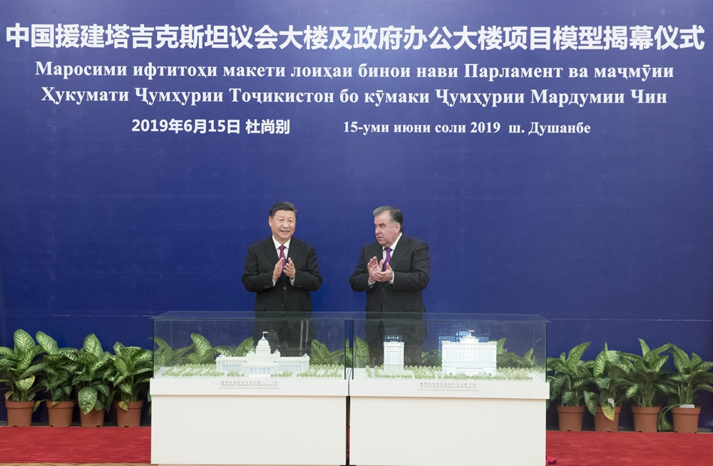 6月15日,國家主席習近平在杜尚別同塔吉克斯坦總統拉赫蒙會談。會談后,兩國元首共同出席中方援塔議會大樓、政府辦公大樓項目模型揭幕儀式。新華社記者 王曄 攝