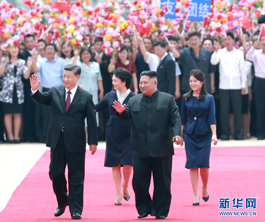 6月20日,中共中央總書記、國家主席習近平乘專機抵達平壤,開始對朝鮮民主主義人民共和國進行國事訪問。朝鮮勞動黨委員長、國務委員會委員長金正恩和夫人李雪主到機場熱情迎接習近平和夫人彭麗媛。朝方在機場舉行隆重歡迎儀式。 新華社記者 龐興雷 攝