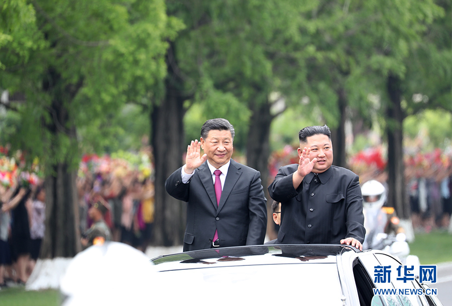 6月20日,中共中央總書記、國家主席習近平乘專機抵達平壤,開始對朝鮮民主主義人民共和國進行國事訪問。朝鮮勞動黨委員長、國務委員會委員長金正恩和夫人李雪主到機場熱情迎接習近平和夫人彭麗媛。朝方在機場舉行隆重歡迎儀式。歡迎儀式結束后,習近平與金正恩同車前往錦繡山太陽宮廣場,沿途數十萬群眾夾道歡迎。 新華社記者 申宏 攝