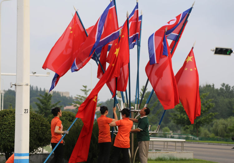 6月19日,當地工作人員在平壤市區街邊安裝朝中兩國國旗。新華社記者江亞平攝