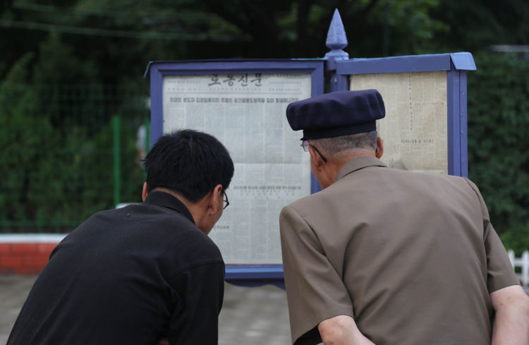 6月19日,在平壤凱旋門附近的一處報紙櫥窗前,市民閱讀習近平總書記在朝鮮主流媒體《勞動新聞》發表的署名文章。新華社記者江亞平攝