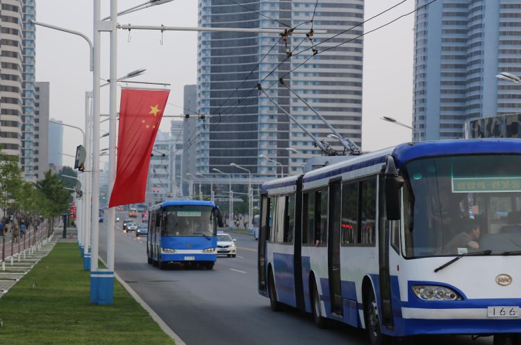6月19日,平壤市區主要大街倉田大街兩旁已經懸掛著朝中兩國國旗。新華社記者江亞平攝