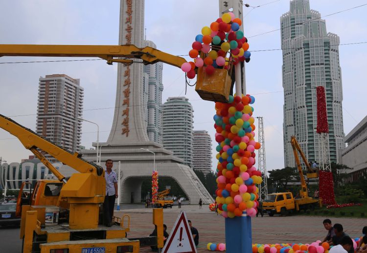 6月19日,當地工作人員在平壤黎明大街街邊懸掛彩球。新華社記者江亞平攝