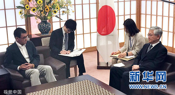 7月19日,日本東京,日本外務大臣河野太郎召見韓國駐日本大使南官杓,抗議韓方對日方提出的成立包含第三國成員的仲裁委員會來解決“強征勞工索賠案”的提議不予回應的做法。(圖片來源:視覺中國)