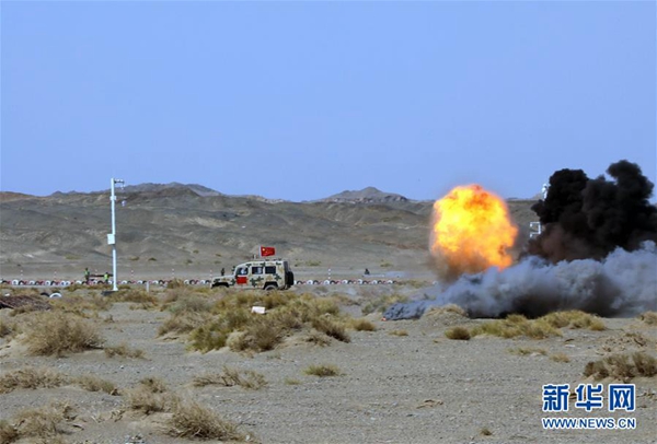 在“國際軍事比賽-2019”“安全環境”項目單組賽中,中國參賽隊快速通過雷爆區(8月8日攝)。新華社發(王軍強 攝)