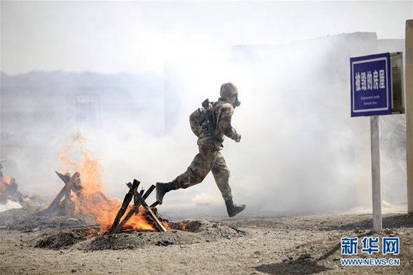 在“國際軍事比賽-2019”“安全環境”項目單組賽中,中國參賽隊員通過火障(8月8日攝)。新華社發(王鵬飛 攝)
