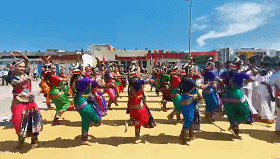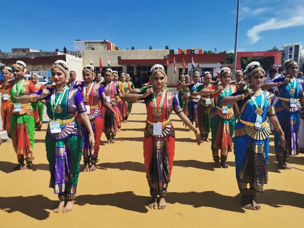 民眾們載歌載舞,有人跳起婆羅多舞,有人踩高蹺、劃旱船,盛情歡迎習(xí)主席的到來。