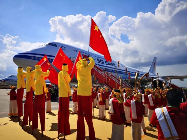 金奈國際機(jī)場內(nèi),鮮花紅毯相襯,當(dāng)?shù)孛癖娕懦刹煌年嚵校群蛄?xí)主席的到來。