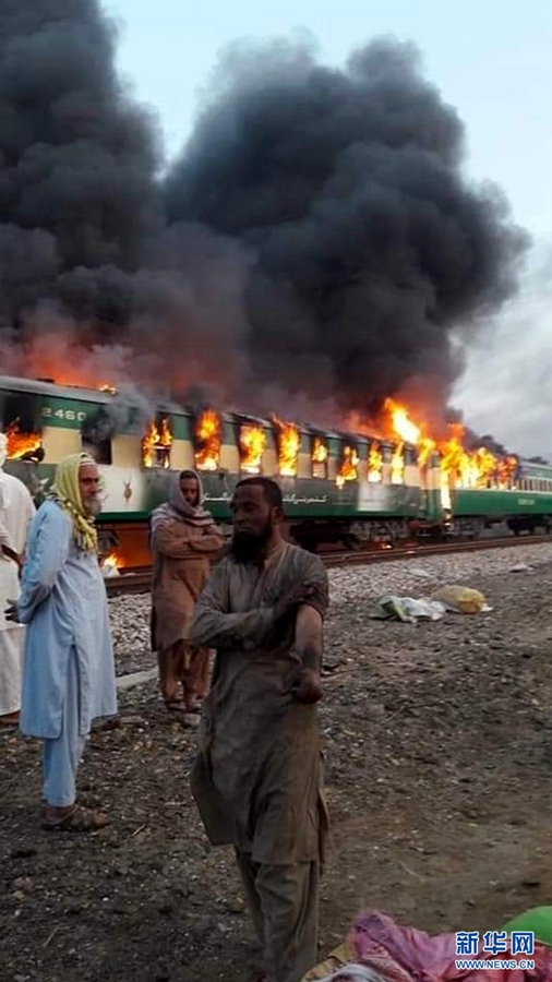 10月31日,在巴基斯坦拉希姆亞爾汗,人們站在起火的列車旁。巴基斯坦官方救援機構說,巴一輛旅客列車31日在巴東部旁遮普省拉希姆亞爾汗地區起火,目前已導致至少65人死亡,14人受傷。 新華社發