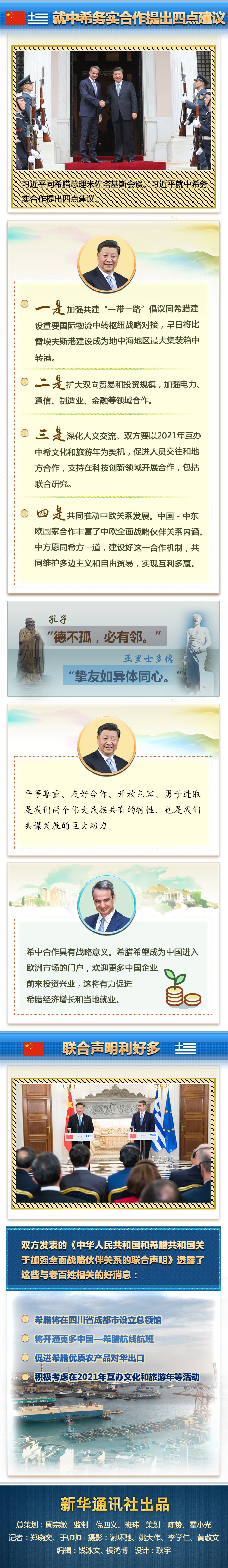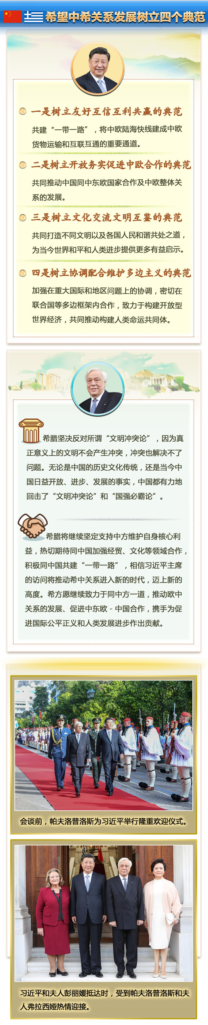 新華社雅典11月12日電 國家主席習(xí)近平11月10日晚抵達(dá)雅典,開始對希臘進(jìn)行國事訪問。11日上午,習(xí)主席的訪問活動異常密集:向希臘無名戰(zhàn)士紀(jì)念碑獻(xiàn)花圈,出席希臘總統(tǒng)帕夫洛普洛斯舉行的隆重歡迎儀式并同帕夫洛普洛斯舉行會談,旋即又同總理米佐塔基斯舉行會談、出席合作文本交換儀式、共同會見記者。中希兩國領(lǐng)導(dǎo)人就雙邊關(guān)系及共同關(guān)心的國際和地區(qū)問題深入交換意見,達(dá)成廣泛共識。