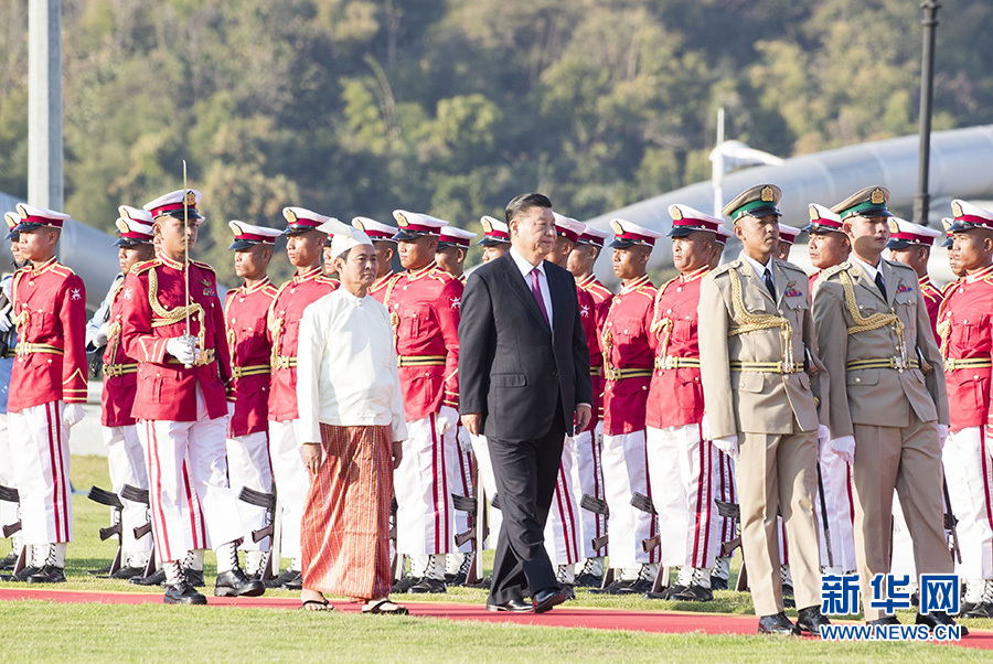 當(dāng)?shù)貢r間1月17日下午,國家主席習(xí)近平在內(nèi)比都總統(tǒng)府出席緬甸總統(tǒng)溫敏舉行的隆重歡迎儀式。這是習(xí)近平在溫敏陪同下檢閱儀仗隊。 新華社記者 黃敬文 攝