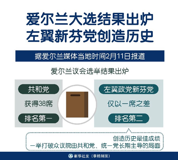 新華社都柏林2月11日電(記者張琪)據(jù)愛爾蘭媒體11日報(bào)道,愛爾蘭議會(huì)選舉結(jié)果出爐:共和黨獲得38席,排名第一;左翼政黨新芬黨僅以一席之差排名第二,創(chuàng)造歷史最佳成績,一舉打破眾議院由共和黨、統(tǒng)一黨長期主導(dǎo)的局面。