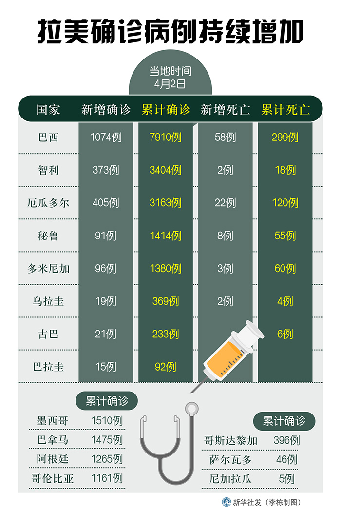 新華社圣保羅4月2日電 綜合新華社駐拉美地區(qū)記者報道:拉美各國衛(wèi)生部門2日發(fā)布的新冠疫情最新數(shù)據(jù)顯示,拉美地區(qū)確診病例持續(xù)增加。多國采取了隔離、停課、宵禁等措施應對疫情。
