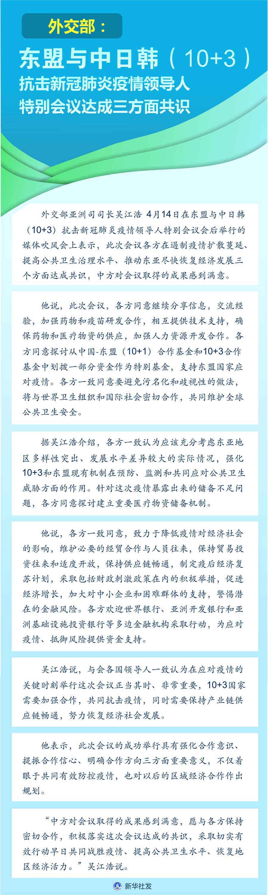 新華社北京4月14日電(記者伍岳)外交部亞洲司司長吳江浩14日在東盟與中日韓(10+3)抗擊新冠肺炎疫情領導人特別會議會后舉行的媒體吹風會上表示,此次會議各方在遏制疫情擴散蔓延、提高公共衛生治理水平、推動東亞盡快恢復經濟發展三個方面達成共識,中方對會議取得的成果感到滿意。