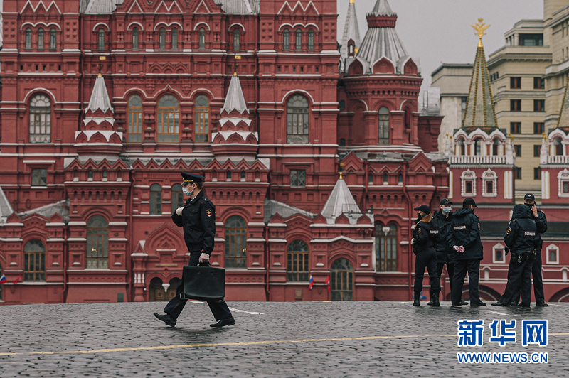 5月4日,一名警察(左)經過俄羅斯莫斯科紅場。 為遏制新冠疫情蔓延,3月30日起莫斯科和俄多城實施居家隔離制度。 新華社發(fā)(葉甫蓋尼·西尼岑攝)