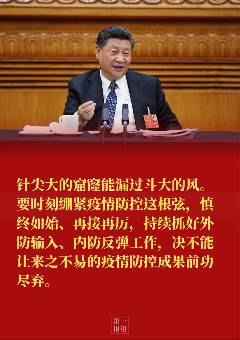 習近平指出:“針尖大的窟窿能漏過斗大的風。要時刻繃緊疫情防控這根弦,慎終如始、再接再厲,持續抓好外防輸入、內防反彈工作,決不能讓來之不易的疫情防控成果前功盡棄?!?