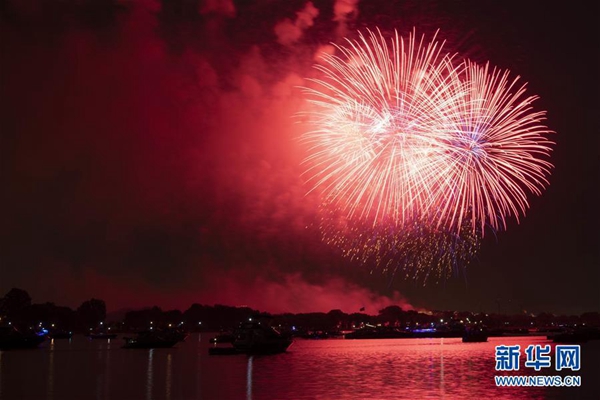 7月4日,焰火在美國華盛頓上空綻放,慶祝美國獨立日。新華社記者 劉杰 攝