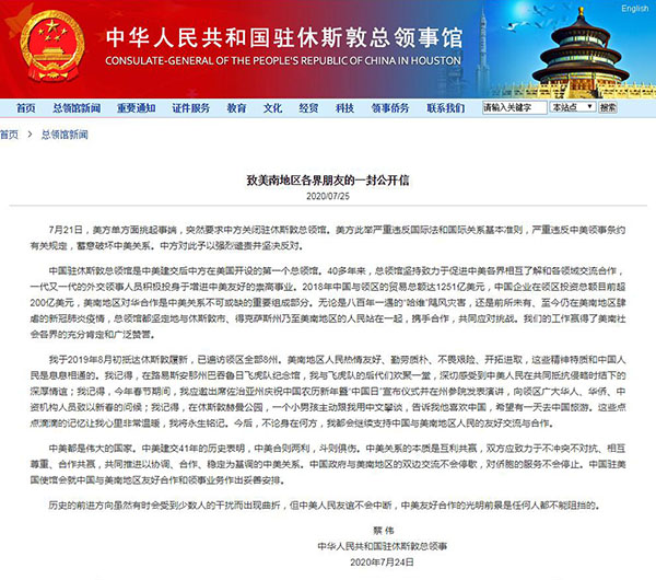 7月21日,美方單方面挑起事端,突然要求中方關閉駐休斯敦總領館。美方此舉嚴重違反國際法和國際關系基本準則,嚴重違反中美領事條約有關規定,蓄意破壞中美關系。中方對此予以強烈譴責并堅決反對。