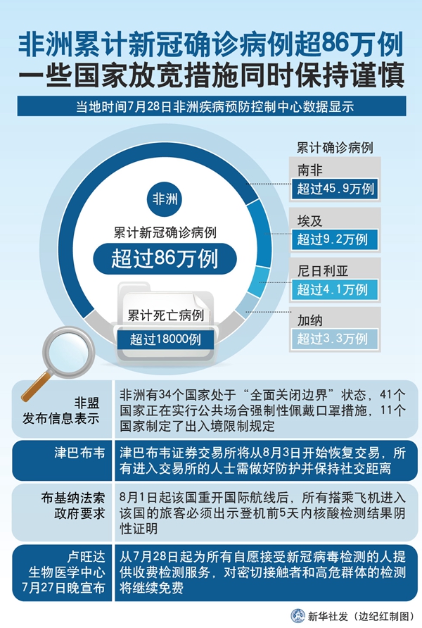 新華社洛美7月28日電 綜合新華社駐非洲地區記者報道:非洲疾病預防控制中心28日數據顯示,非洲累計新冠確診病例超過86萬例,累計死亡病例超過18000例。在逐步放寬措施的同時,一些非洲國家情況不容樂觀,政府保持謹慎態度。
