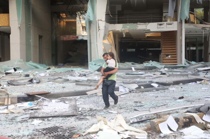 8月4日,在黎巴嫩首都貝魯特,一名男子抱著孩子走過嚴(yán)重受損的建筑。新華社發(fā)(比拉爾·賈維希攝)