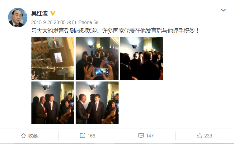 時(shí)任聯(lián)合國(guó)副秘書長(zhǎng)吳紅波說(shuō),習(xí)主席走下講臺(tái)時(shí),二三十位其他國(guó)家領(lǐng)導(dǎo)人排隊(duì)與他握手表示祝賀,走廊里擠得滿滿當(dāng)當(dāng)。