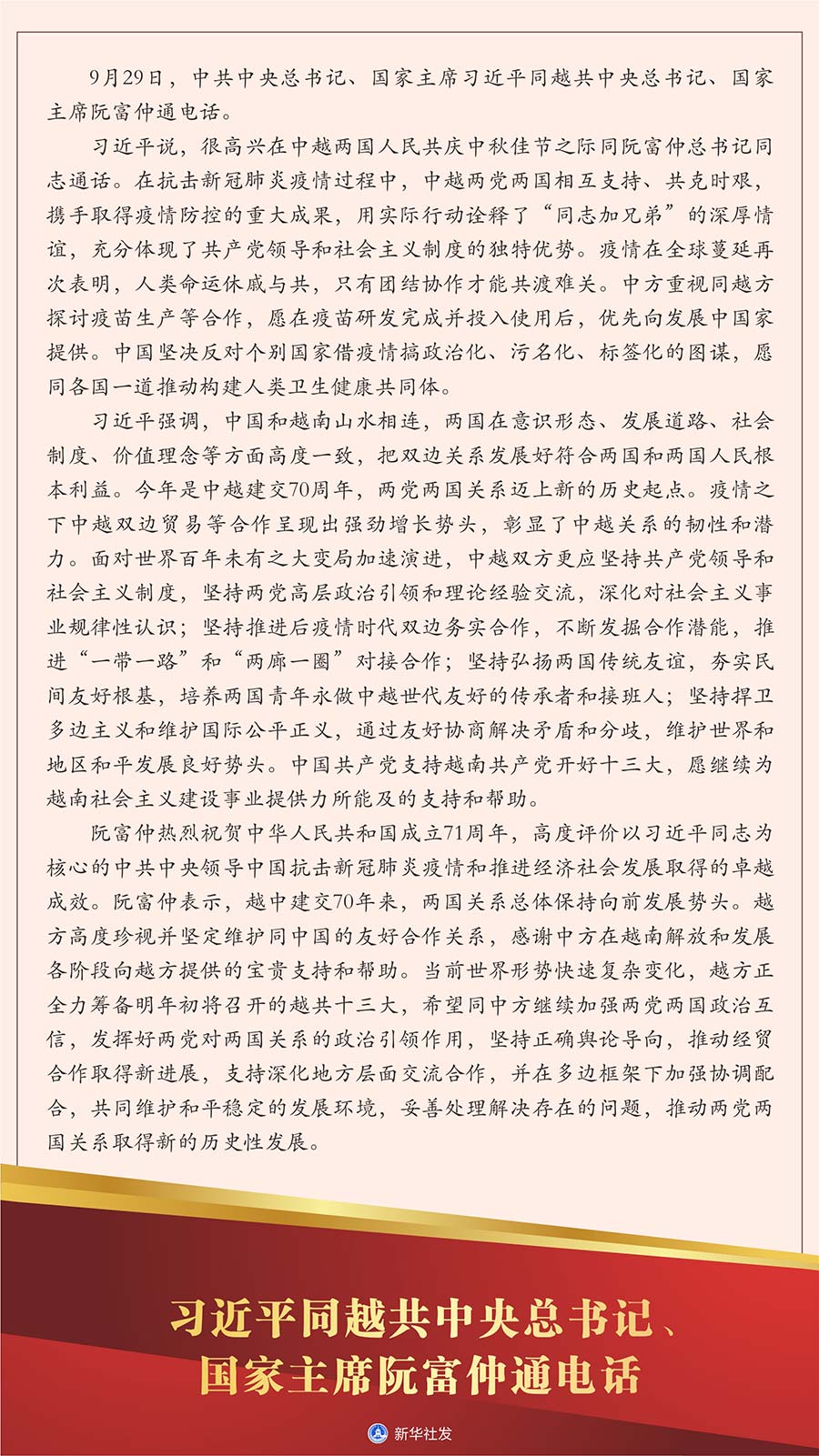 新華社北京9月29日電 9月29日,中共中央總書記、國家主席習(xí)近平同越共中央總書記、國家主席阮富仲通電話。
