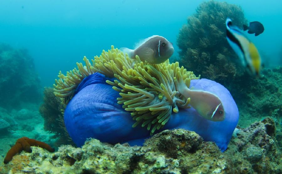 這是2020年5月28日在中國海南三亞蜈支洲島海域拍攝的與海葵共生的小丑魚。新華社記者 楊冠宇 攝