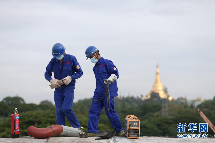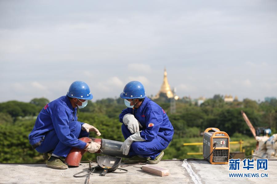10月28日,在緬甸仰光的國家劇院維修改造項目現(xiàn)場,覺泰昂在師父的指導(dǎo)下焊接鋼管。新華社發(fā)(吳昂攝)