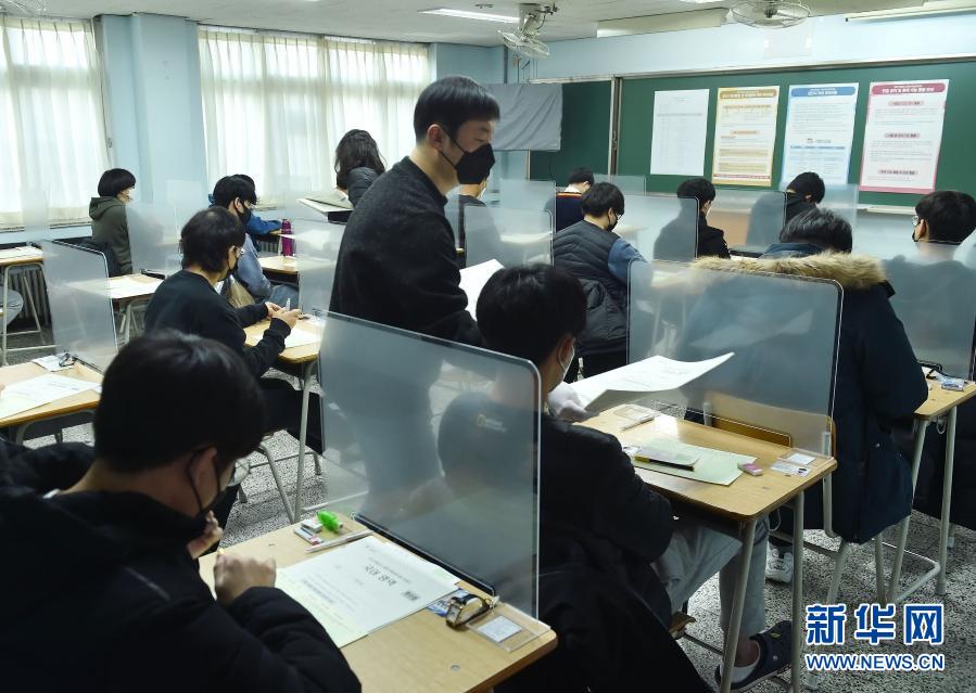 12月3日,在韓國京畿道城南市,監考人員在某考點向考生分發試卷。新華社發(李相浩 攝)