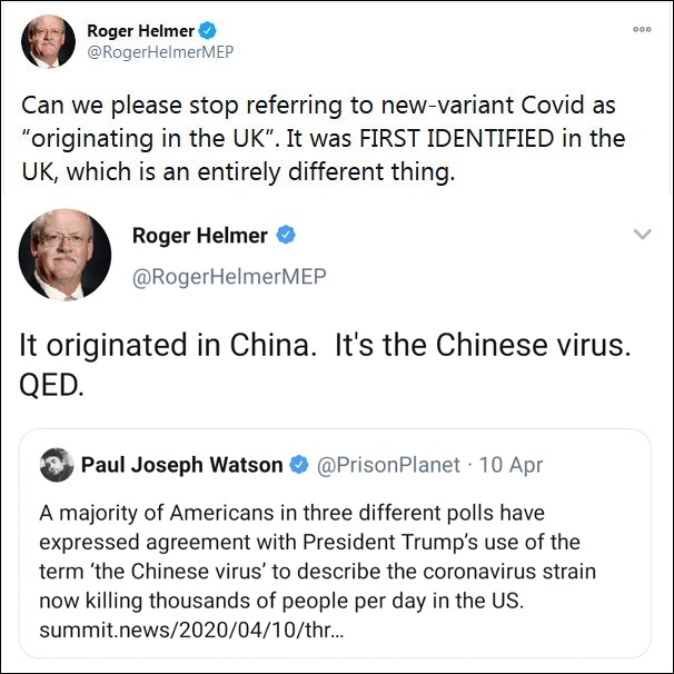 英國出現(xiàn)變異新冠病毒后,世衛(wèi)組織(WHO)將起源地列為英國,不少主流媒體也引用了相關(guān)言論。但這讓英國右翼政黨獨立黨(UKIP)成員,曾擔(dān)任歐洲議會議員羅杰·赫爾默坐不住了。