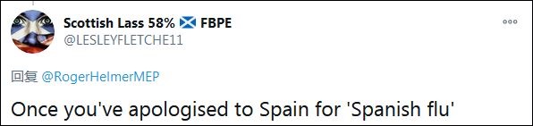 另一名網(wǎng)友接茬說:“只要你為‘西班牙流感’向西班牙道歉。”赫爾默也曾借用“西班牙流感”,為“中國流感”的說法狡辯。