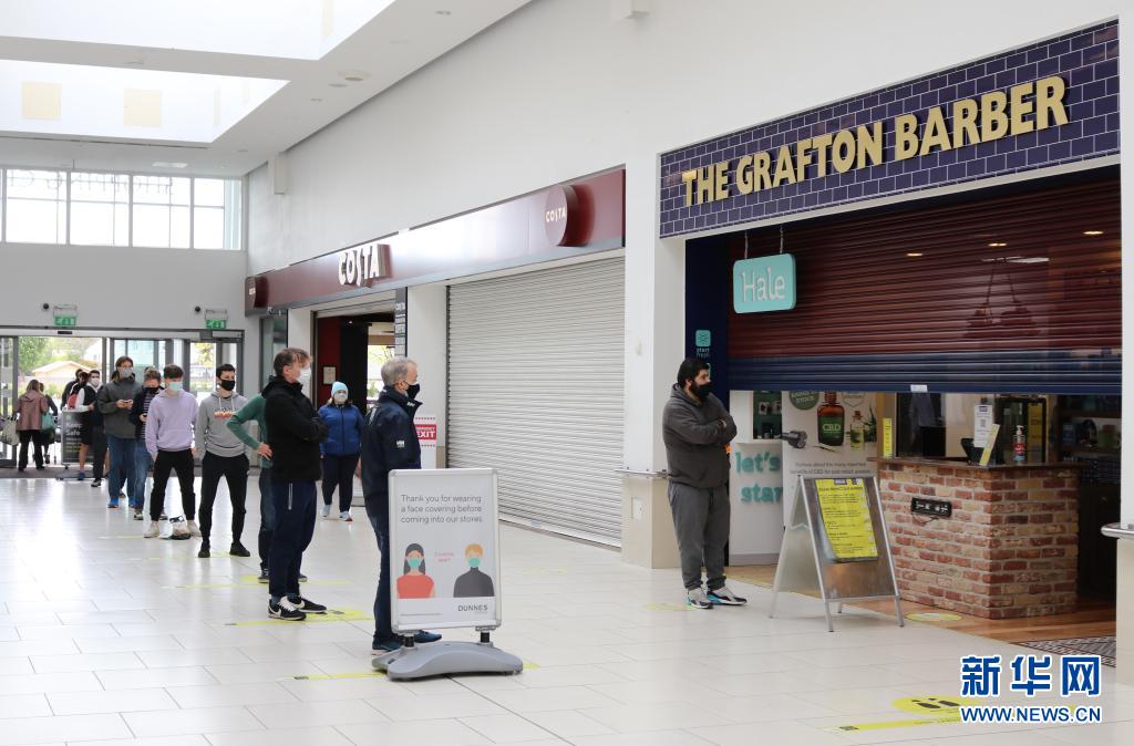 5月10日,人們在愛爾蘭首都都柏林一家重新恢復營業的理發館外排隊。