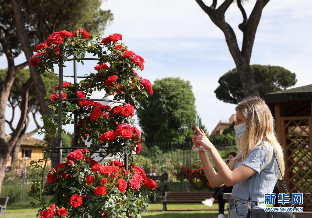 5月17日,一名女子在意大利首都羅馬玫瑰園拍攝照片。