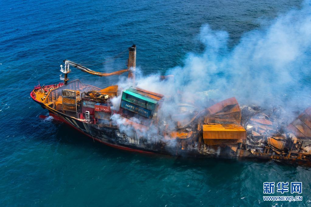 這是6月2日在斯里蘭卡科倫坡港附近拍攝的逐漸下沉的起火貨船“X-PRESS PEARL”號。