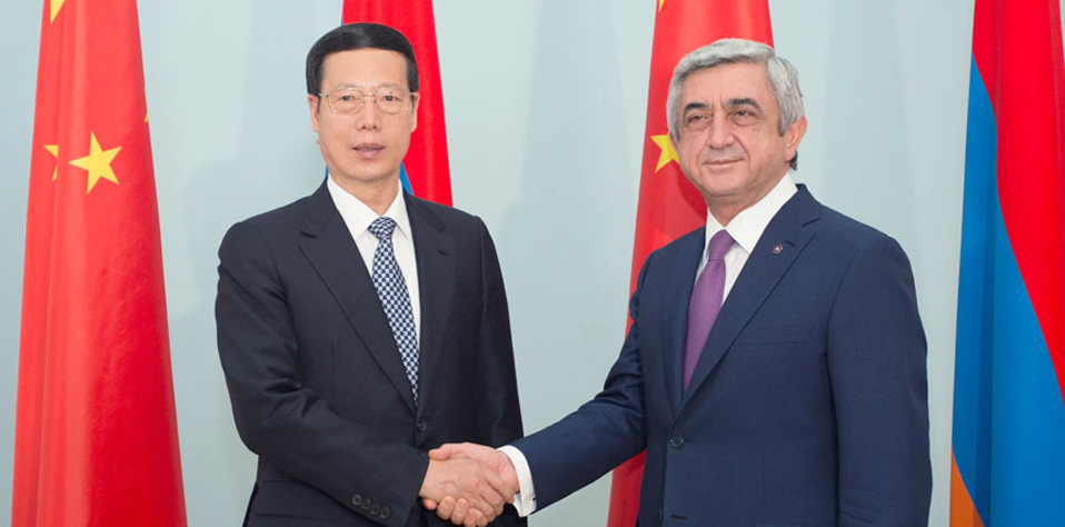 應(yīng)邀訪問(wèn)亞美尼亞的國(guó)務(wù)院副總理張高麗6日在埃里溫會(huì)見(jiàn)亞美尼亞總統(tǒng)薩爾基相。